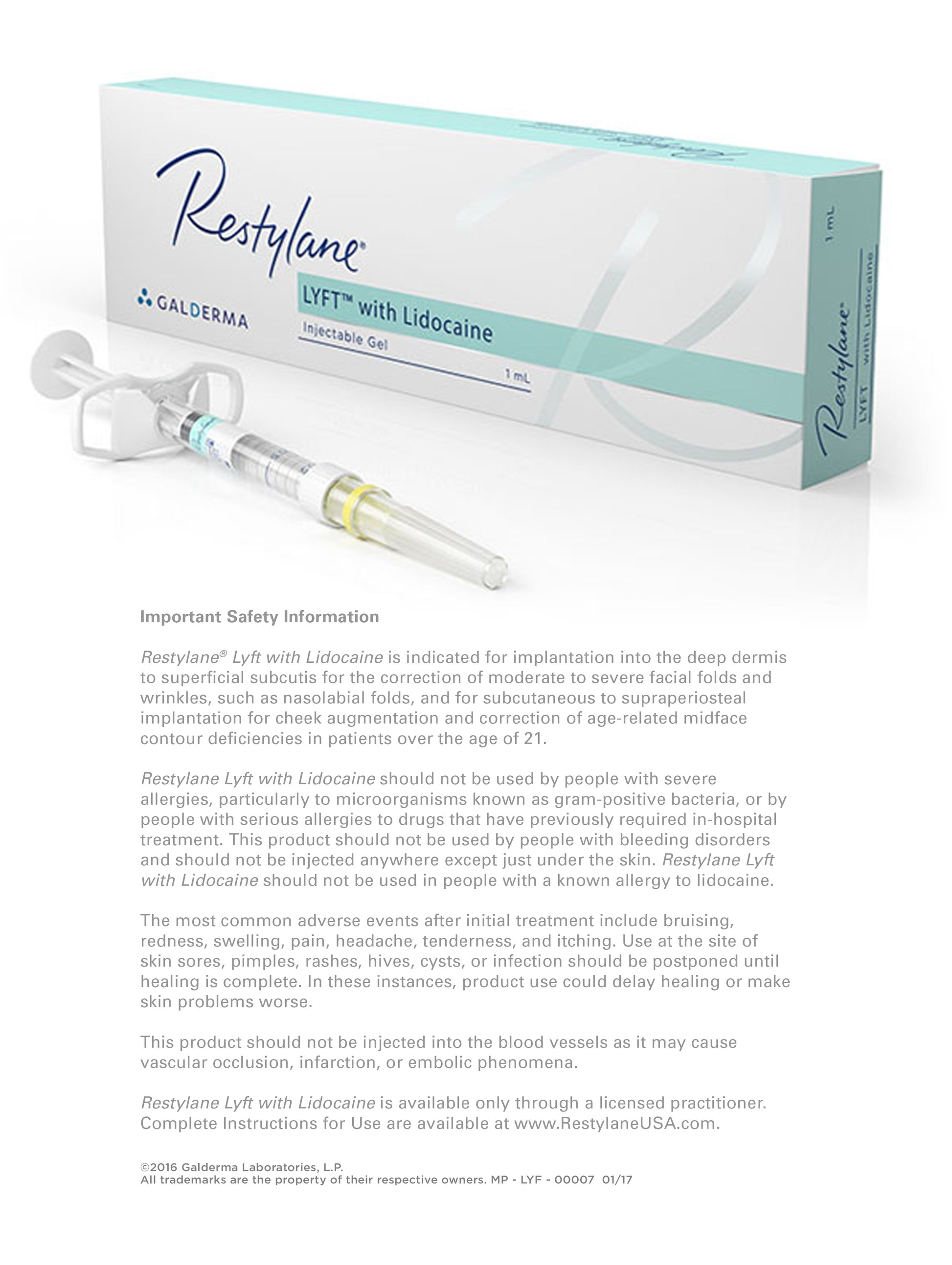 Restylane® Lyft with Lidocaine is injected into the skin with an ultrafine needle to plump the skin to smooth away wrinkles and folds such as the lines from your nose to the corners of your mouth and is injected with an ultrafine needle or a small, blunt-tipped cannula to increase the fullness of your cheeks. Restylane Lyft with Lidocaine may also be injected, using an ultrafine needle under the skin to address volume deficiency in the back of the hand.